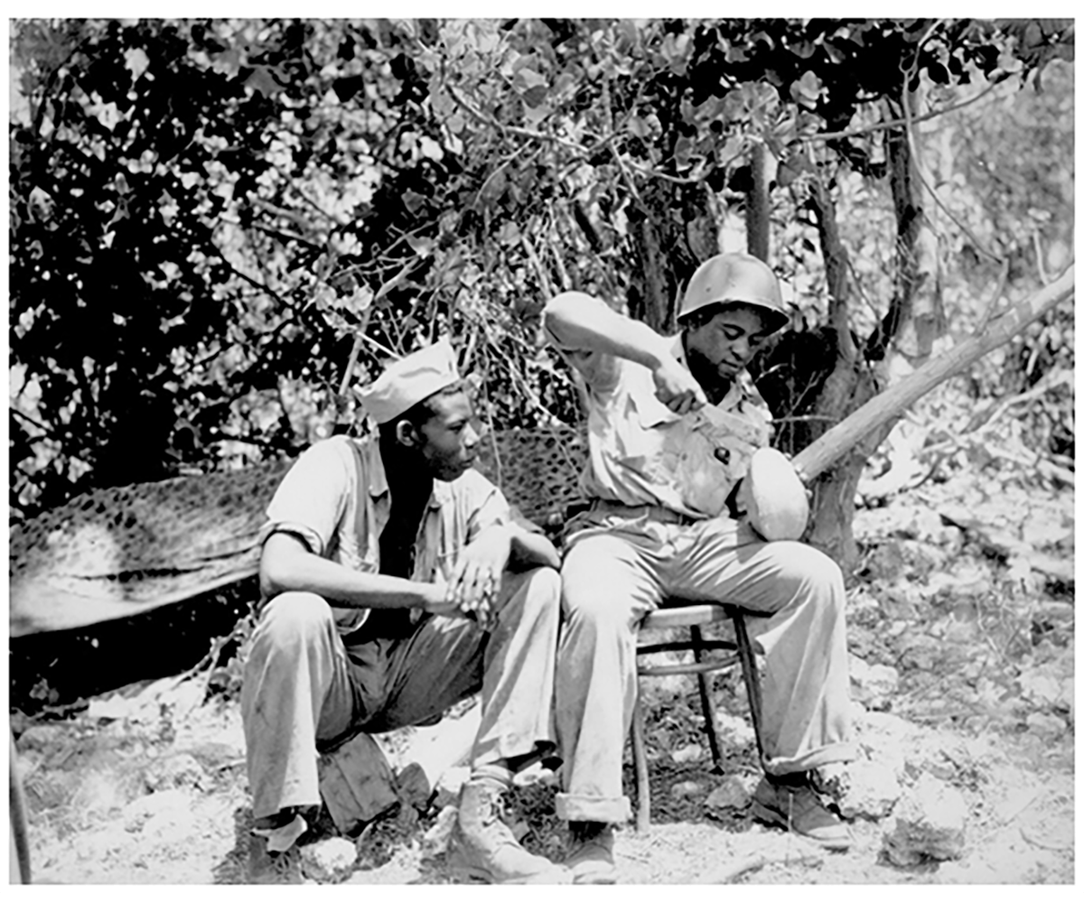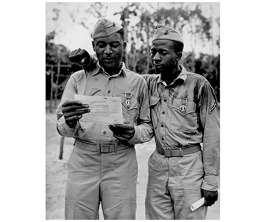 The first black marines decorated by the famed 2nd Marine Dvision somewhere in the Pacific. (Left to right) Staff Sgt Timerlate Kirven and Cpl. Samuel J. Love, Sr., received Purple Hearts for wounds received in the Battle of Saipan.