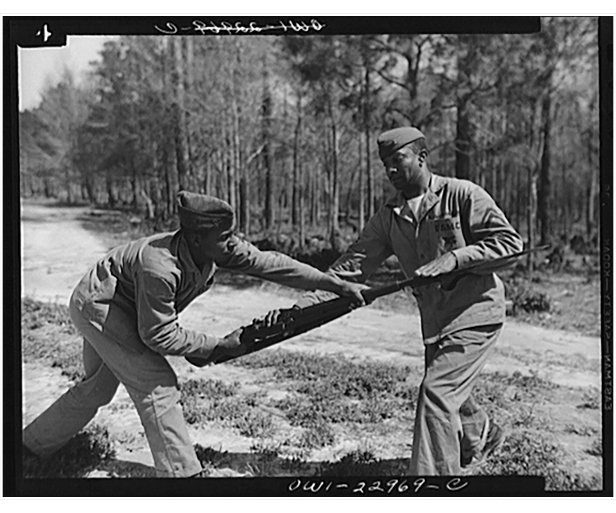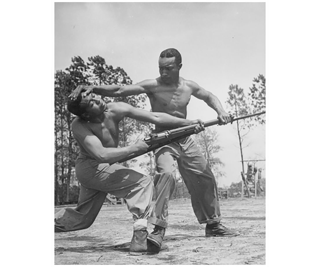 Cpl. Arvin Lou Ghazio, USMC, gives judo instructions to Pvt. Ernest C. Jones, April 1943. Judo instruction is one of the high spots in the life of the latest addition to the Leatherneck Marines at Montford Point, Camp Lejeune, N.C. An instructor shows a recruit how to make the enemy's bayonet useless.