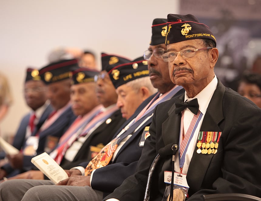 The first interviews of the Montford Point Marines in this project were conducted by Race and Culture reporter, Akilah Davis, who works at our station in Raleigh, and videographer Stephen Nitz, who is a combat veteran of the wars in Iraq and Afghanistan. At the end of their shoot, both told me they were deeply affected. They were emotional. I didn't know exactly what they meant until I traveled from Philadelphia to Camp Lejeune for the commemoration of the Montford Pointers' 80th anniversary. It was the day I walked among heroes and witnessed living history. My emotion was evidenced by the mascara that had washed away by the end of the day. I saw my Daddy in these heroes that had gone through so much. I saw my grandfathers and the veterans in my family in them. I was moved by the sons, grandsons, daughters and wives who had gotten back a piece of their relatives through this medal. This was personal for me. And I really hope their stories resonate with you.