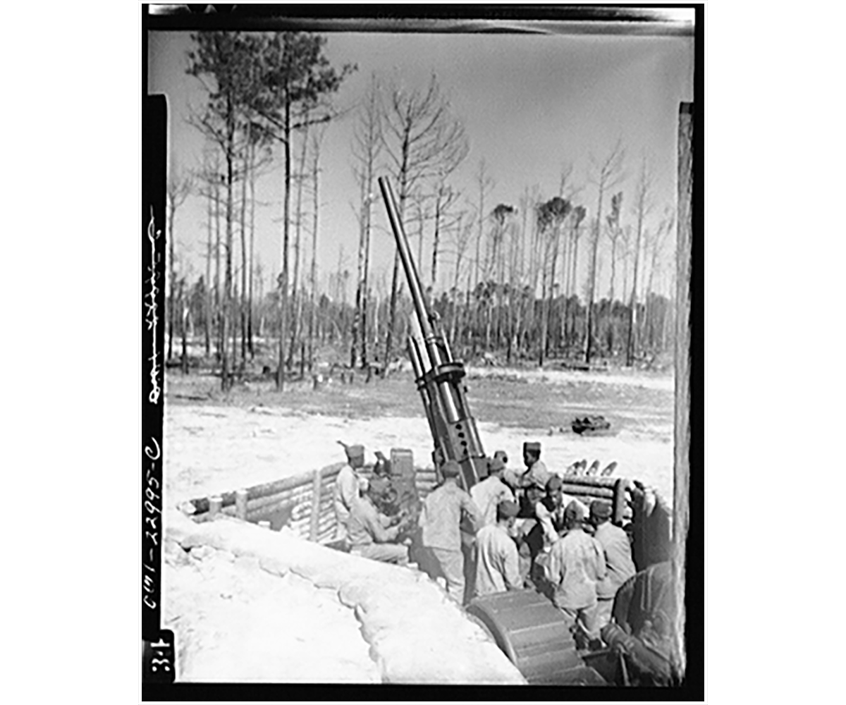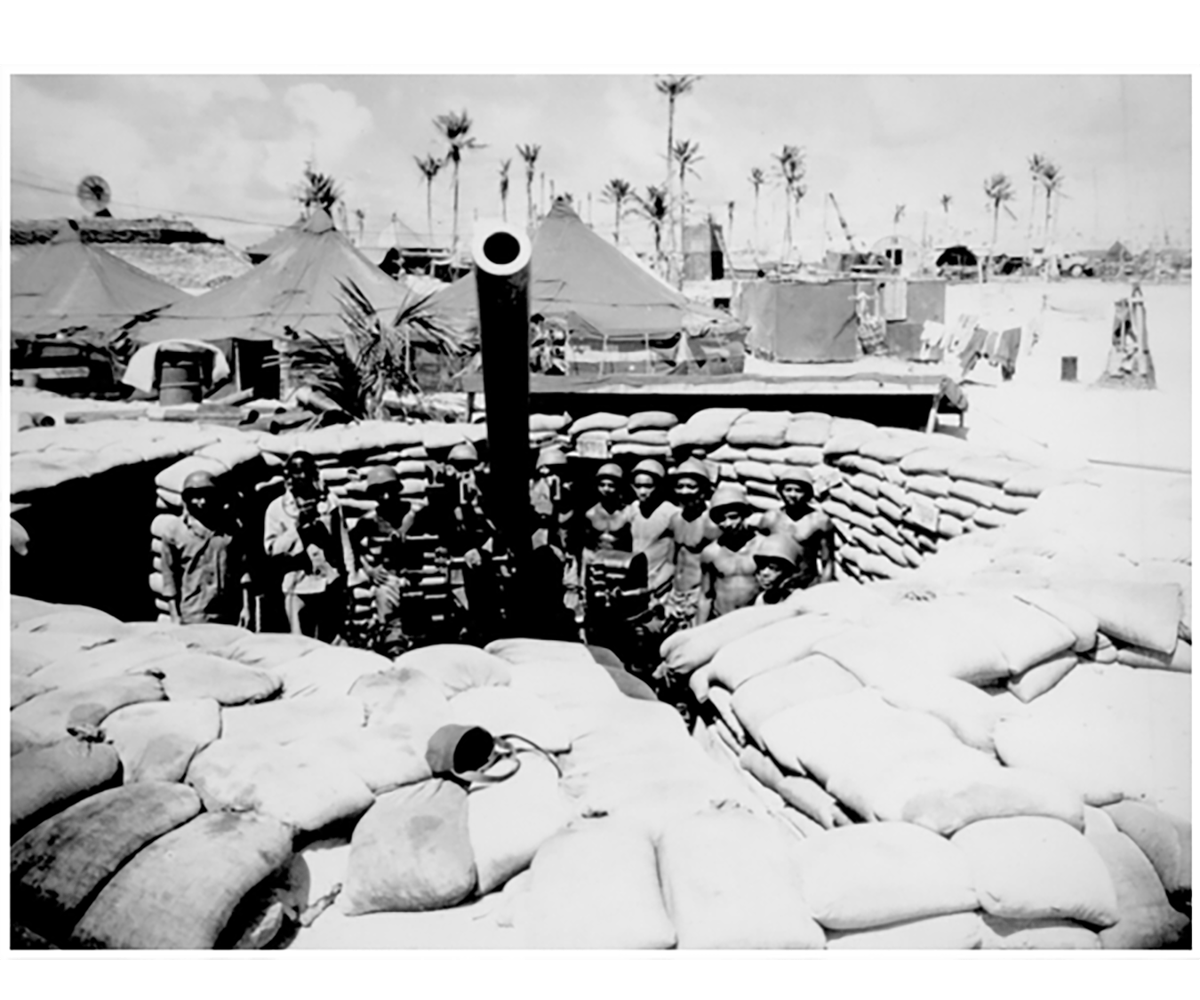 Surrounded by a veteran crew of Marines who have spent 15 months in the southwest and central Pacific, this gun, named the "Lena Horne" by its crew, points majestically skyward. The gun is manned by members of the 51st Defense Battalion, one of two such black units in the Marine Corps during World War II.