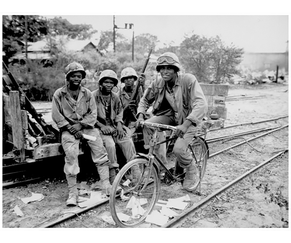 Black Marines, attached to the 3rd Ammunition Company, take time out from supplying ammunition to the front line on Saipan. Riding a captured bicycle is Pfc. Horace Boykin while (left to right) Cpl. Willis T. Anthony, Pfc. Emmitt Shackelford and Pfc. Eugene Purdy watch, June 1944.