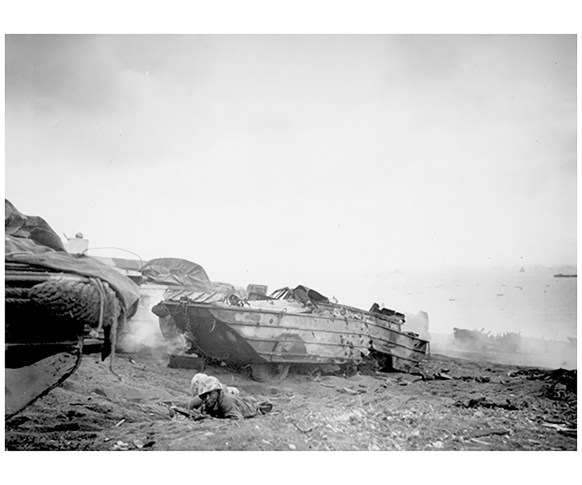 Two duck DUKW drivers become riflemen after their vehicle is destroyed, Feb. 19, 1945.