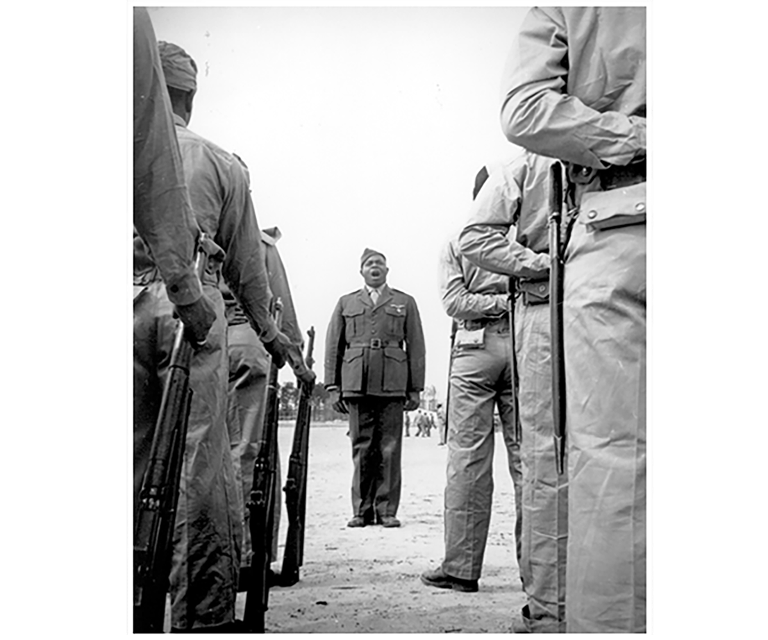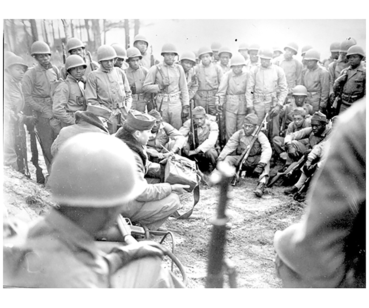 A platoon of black "boot recruits" listen to their drill instructor, Sgt. Gilbert Hubert Johnson, whose job is to turn them into finished Marines at Montford Point, Camp Lejeune, N.C., April 1943.