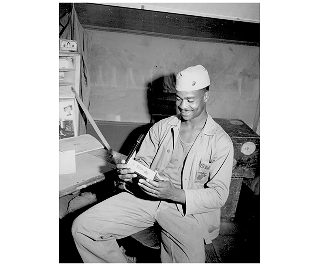 Among the outstanding Marines in the original group of black Marines was Pfc. Walker Manley, formerly an organist of the Christian Church in Raleigh, N.C., and a demonstrator for the Hammond Organ Company, who served as a post organist at Camp Lejeune. (Photo by Roger Smith)