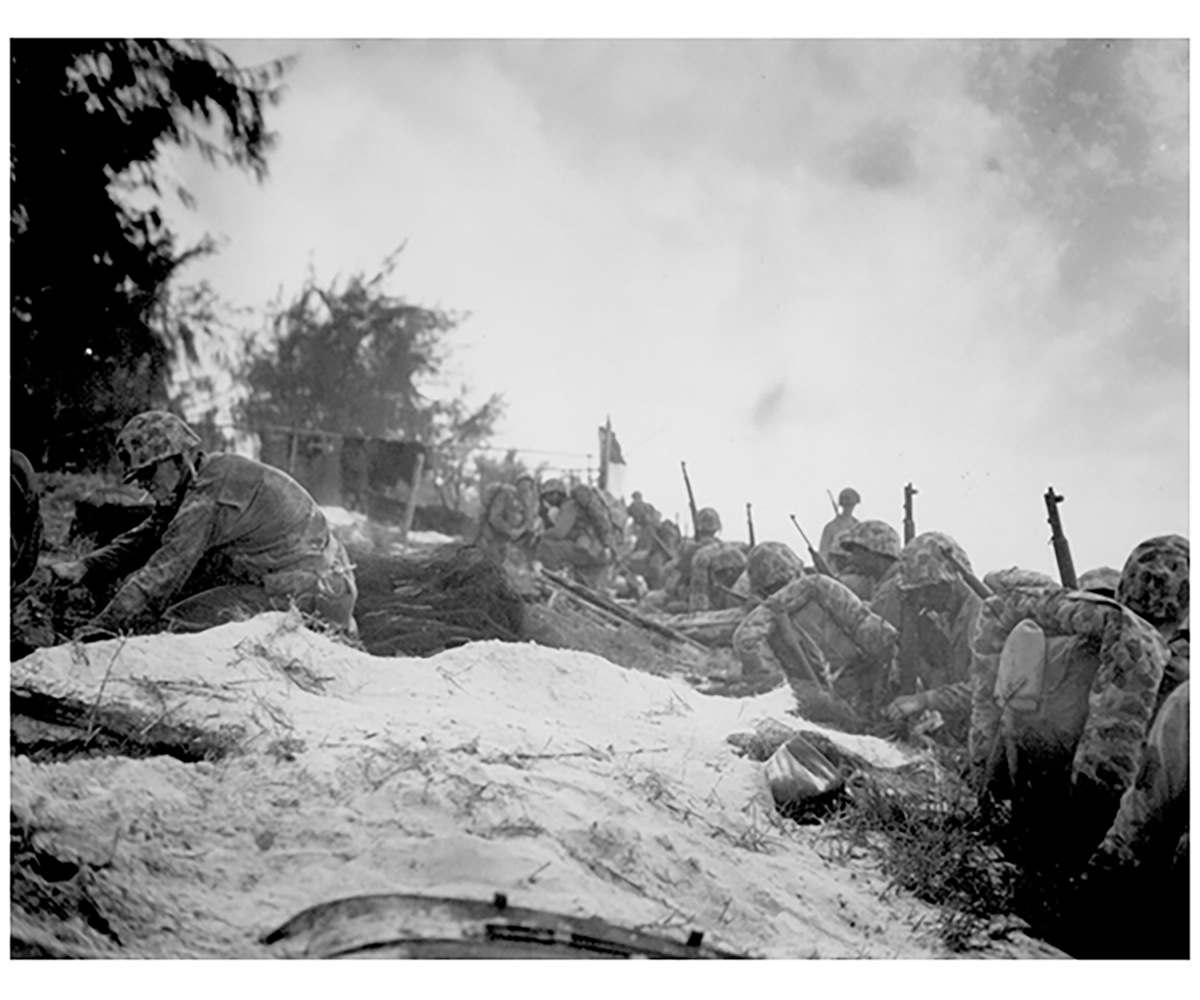 Black assault troops await orders D-day to attack enemy shortly after they had come ashore at Saipan in the Marianas, June 1944. (Photo by Marine Tech. Sgt. William Fitch)