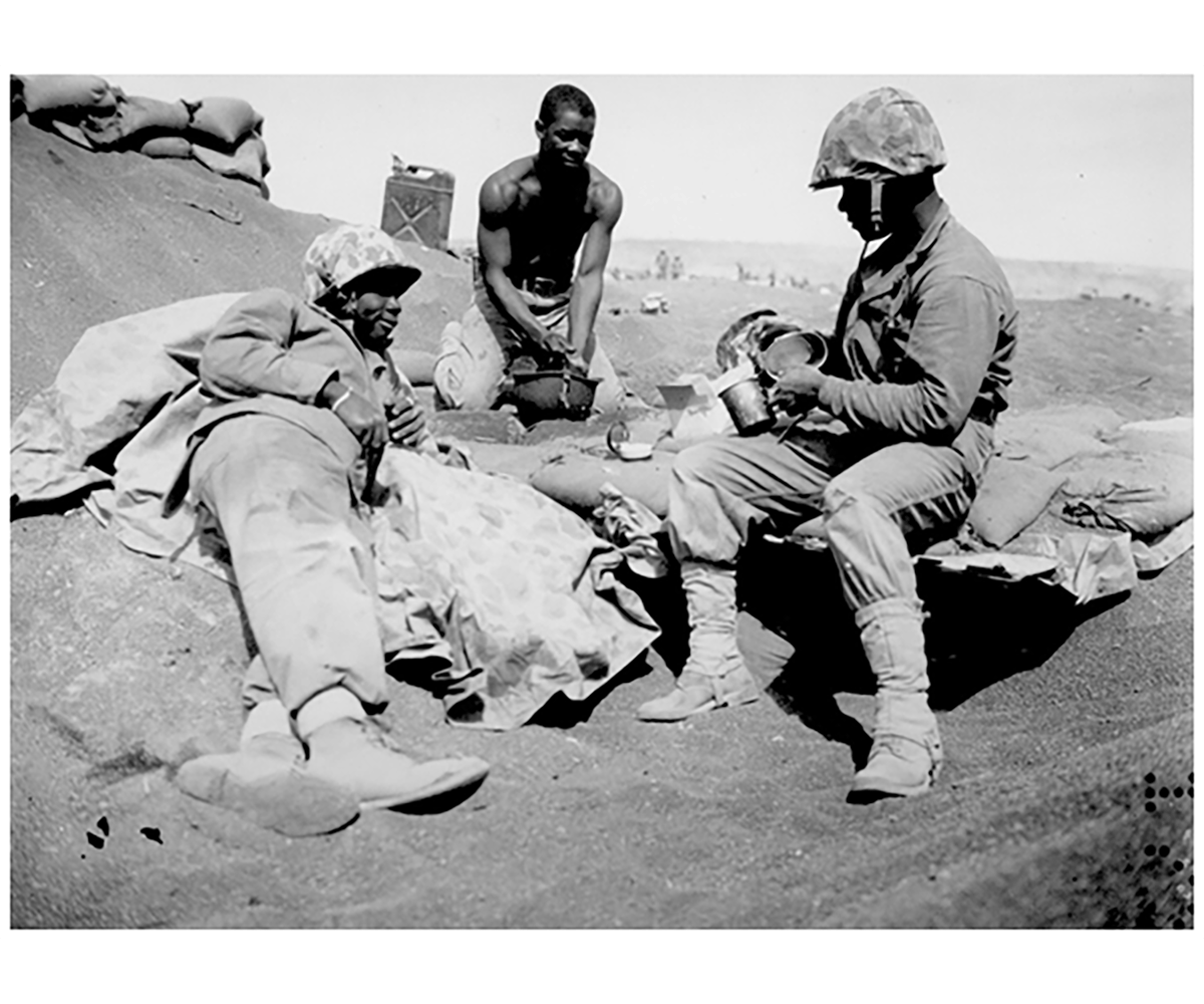 Black Marines on the beach at Iwo Jima are, from left to right, Pfc.'s Willie J. Kanody, Elif Hill and John Alexander, March 1945. (Photo by C. Jones)